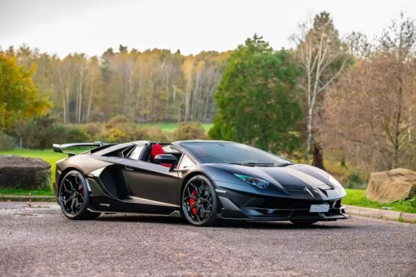 This Aventador SVJ Roadster’s options include carbon fibre bonnet and fixed air intakes (£5,352.00), carbon fibre door mirrors (£2,148.00), red brake calipers (£1,056.00), removeable hardtop in high gloss black, carbon fibre rocker cover (£5,040.00), Style package £6,300), livery to rear wing central pillar (£2,625), carbon fibre SVJ painted logo (£10,500), carbon fibre wheel caps (£624.00), Sensonum premium sound system (£3,156.00), Rosso coloured footplate in aluminium (£1,056.00), Rosso SVJ contrast cross stitching (£1,056.00), Rosso SVJ interior – colour upon choice (£2,412.00), SVJ interior logo in Nero (£528.00), Red rear suspension springs with front lifting system (£1,056.00), NavTrak Pro ADR (£2,520.00), 20’’ front and 21’’ rear Leirion forged wheels in high gloss black with central locking (£3,888.00), navigation and infotainment system with DAB radio (£624.00), park assistance – rear parking sensors and rear view camera (£2,628.00), multifunction steering wheel trimmed in full alcantara (£1,152.00), Rosso illuminating visibility and light package (£1,572.00), seat belts in Rosso Alala (£1,320.00) and race seats in full Rosso alcantara (£1,750.00). Further, the car benefits from PPF applied to all the paintwork.